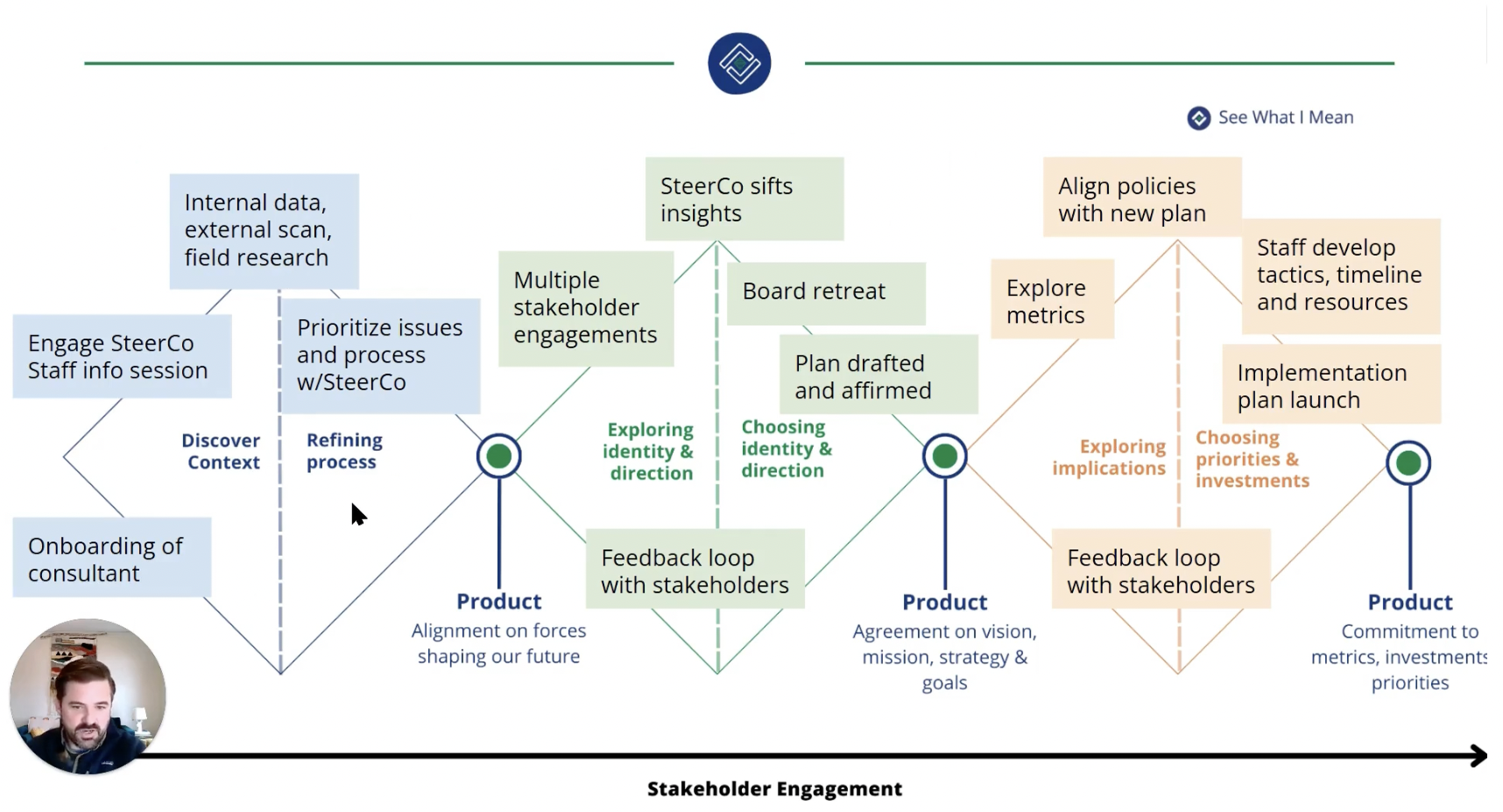 Exploring identity & direction: Multiple stakeholder engagements, feedback loop with stakeholders, steering committee sifts insights